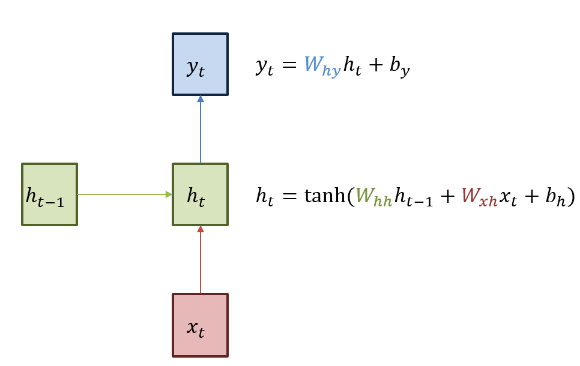 아래 그림처럼 순환 $W_{hh}$ 의 가중치와 입력 $W_{xh}$ 의 두 개의 가중치가 존재합니다.