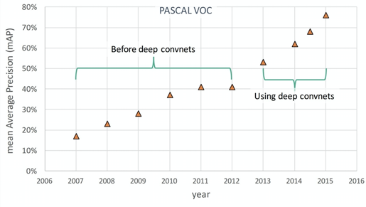 위 그래프에서 2012년까지 Object Detection의 성능이 점점 정체되어있다가 2013년부터 딥러닝이 도입되었고 빠르게 성능이 향상되는 것을 볼 수 있습니다.