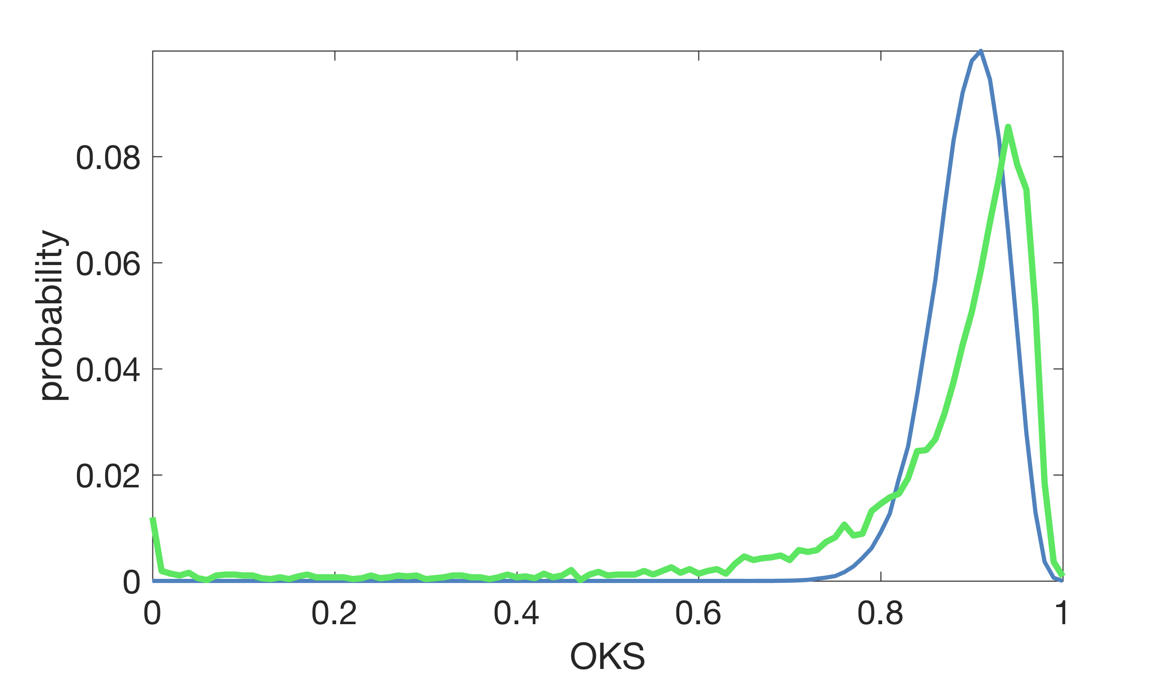 아래 그래프는 객체 당 10개의 독립 키 포인트(파란 곡선)을 가정하는 $k_i = 2\sigma_i$ 로 예측 OKS 분포를 그리고, 인간 OKS 점수의 실제 분포를 녹색 곡선으로 표시합니다.