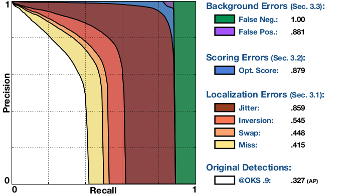 요약하면, OKS=0.9에서의 위 알고리즘의 오류는 불완전한 localization, 대부분의 jitter error, 누락된 Object Detection이 지배적입니다.